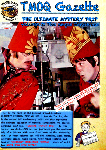Hot on the heels of the previous ground-breaking ULTIMATE MYSTERY TRIP VOLUME 1: Hop On The Bus, this is the second 50th Anniversary 2 DVD set that represents the ultimate collection of material surrounding the Beatles notorious 1967 film, ‘MAGICAL MYSTERY TOUR”. In this second new double DVD set, we guarantee you the continued trip of a lifetime with more fresh looks at this wonderful film. In these volumes you will find outtakes, work prints, alternate scenes, music videos, home movie footage and tons of PREVIOUSLY UNRELEASED FOOTAGE – much of which has NEVER BEEN SEEN BEFORE!