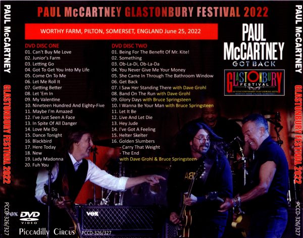 Paul McCartney – Glastonbury Festival (2022) DVD and CD Edition, 3 CD-R discs, 2 DVD-R discs, Live at Pyramid Stage, Worthy Farm, Pilton, England on June-25-2022.